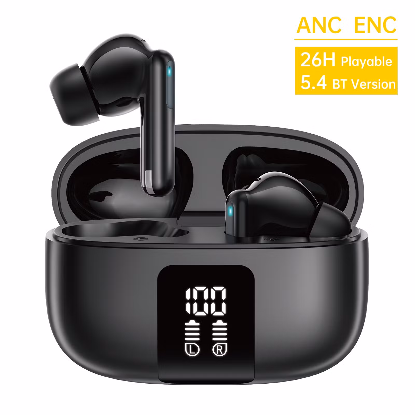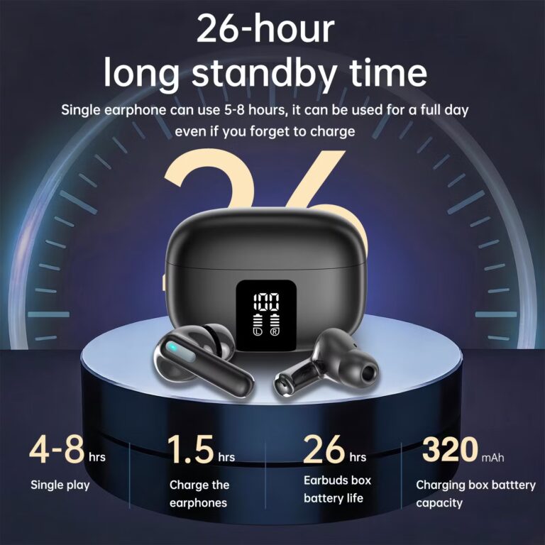 Premium wireless true wireless earbuds with Active Noise Cancellation (ANC) and Environmental Noise Cancellation (ENC) for clearer calls and immersive sound. Equipped with Bluetooth 5.4 for stable connection up to about 10 m, and a USB‑C charging case that delivers up to 26 hours total battery life including the earbuds’ playtime. Fast recharge in approximately 1.5 hours and clear frequency response make them great for music, calls, and everyday use.